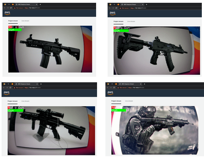 I was able to hold my DeepLens in front of different pictures of firearms and the green bar on the left indicates that there is a weapon in frame.